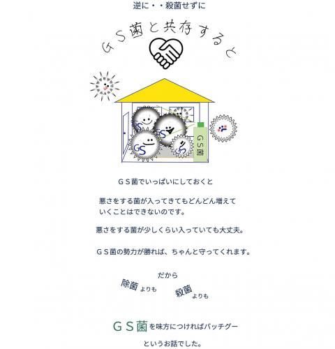 柔軟剤が苦手な方などに特にオススメ。嫌なニオイは無くなり、ふんわり柔らかに仕上がり、雑菌の繁殖を抑えてくれます。合わせて洗濯槽の汚れやカビの付着も激減し、お風呂の残り湯に投入しお風呂掃除も楽に汚れが落とせます。色んな場面で使え、100%自然由来ですので、お子様にも安心安全な万能酵素です。 GS菌と上田微生物が独自で開発した有用微生物菌群(※)です。 (※)乳酸菌、バチルス菌、各種消化酵素(タンパク質分解酵素、炭水化物分解酵素、脂肪分解酵素、アルコール分解酵素)他